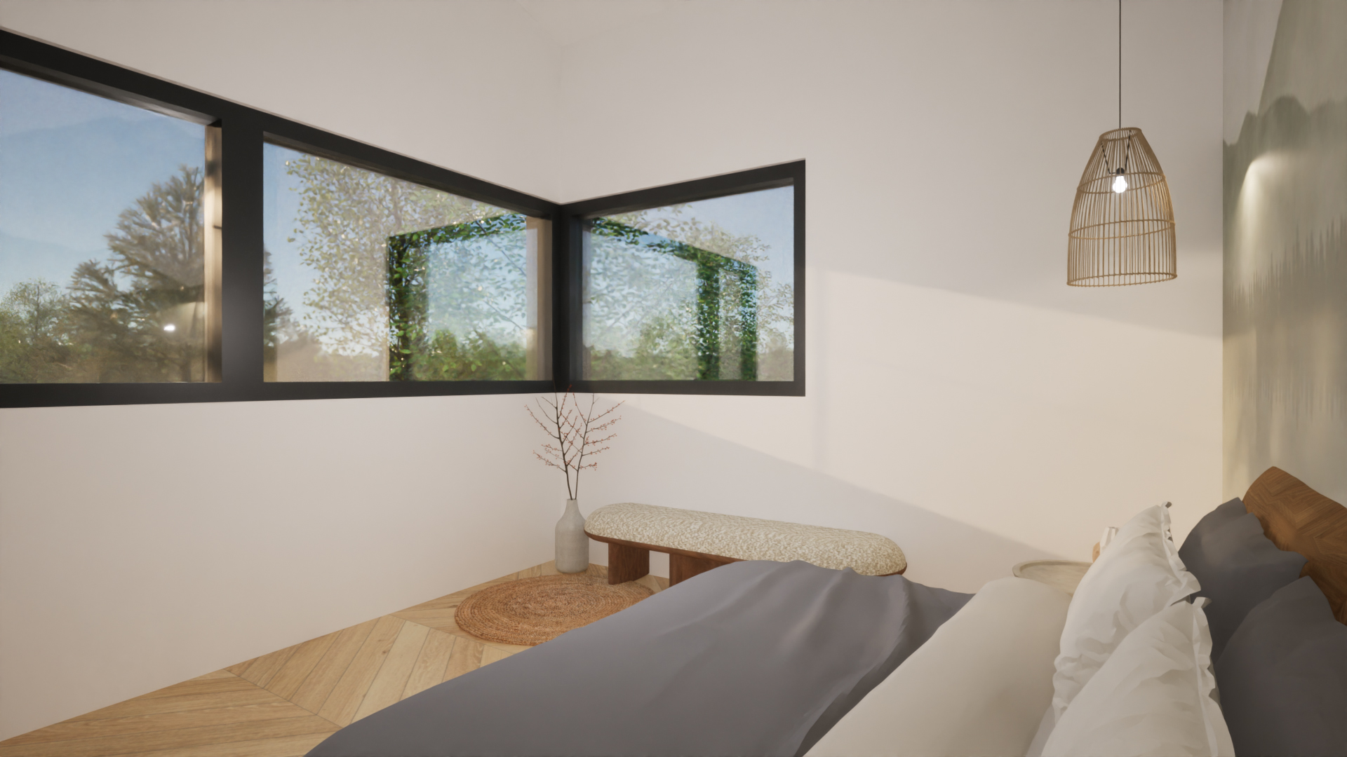 L’espace nuit à l’étage assure intimité et tranquillité, tandis que la pièce à vivre spacieuse et lumineuse au rez-de-chaussée s’ouvre sur un jardin privé, créant ainsi un lien unique avec la nature environnante.